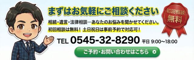 初回相談は無料ですので、お気軽にお問い合わせください。事務所内の雰囲気を話しやすい形にし、ご依頼者の方のお悩みを言い残すことなく仰っていただけるよう心掛けております。出張相談も承ります(富士市・富士宮市は無料で伺います)。