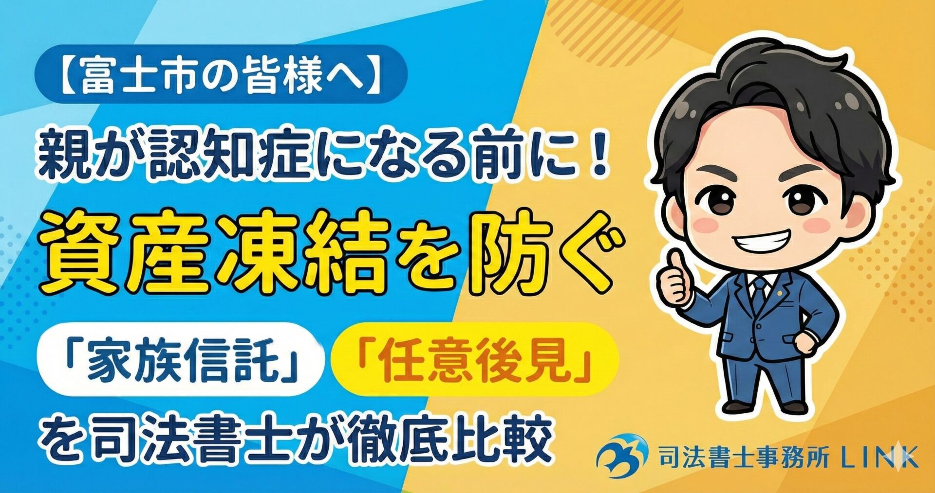 この記事では、相続・認知症対策を専門とする司法書士として、この深刻な資産凍結を防ぐための代表的な2つの対策、「家族信託」と「任意後見制度」について、富士市にお住まいの皆様にも分かりやすく徹底比較します。